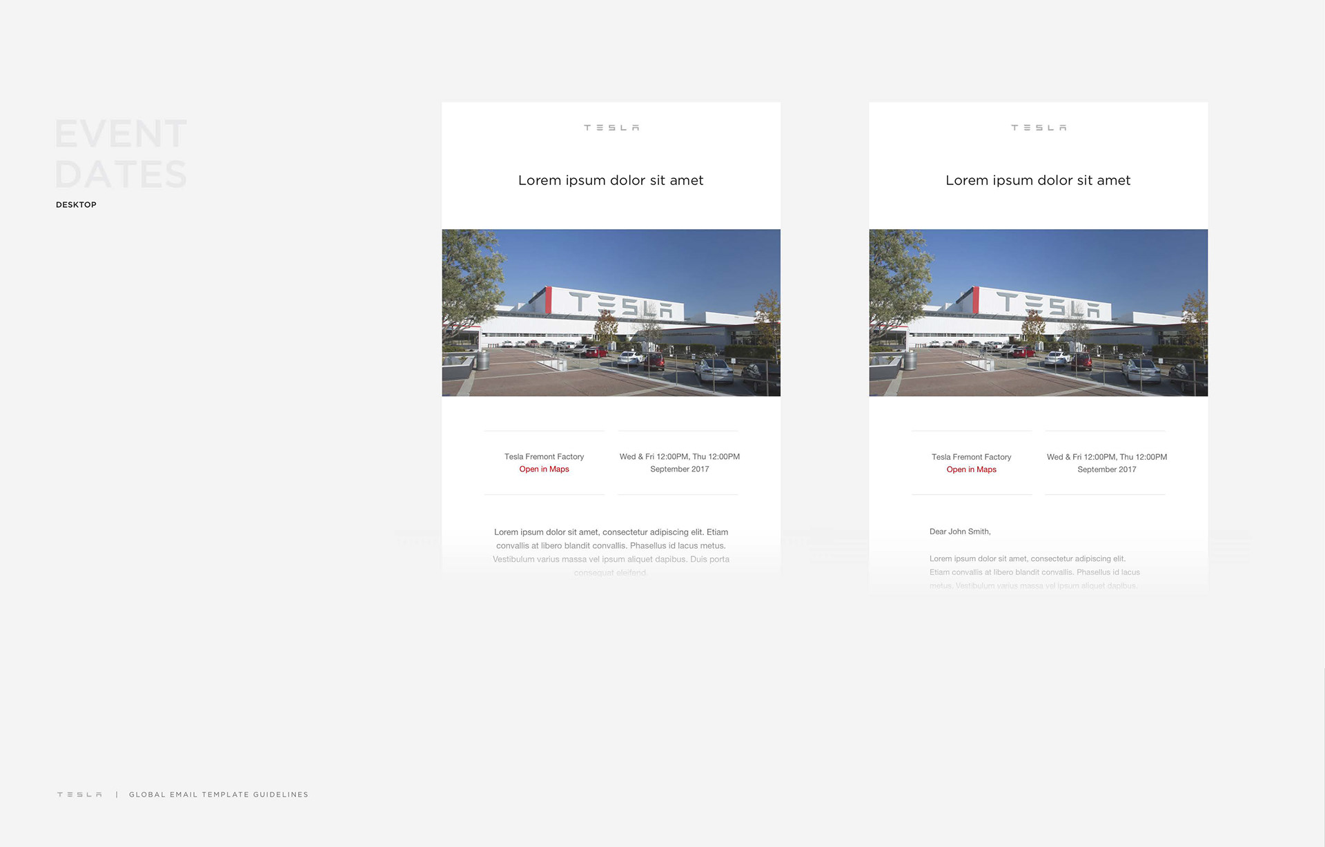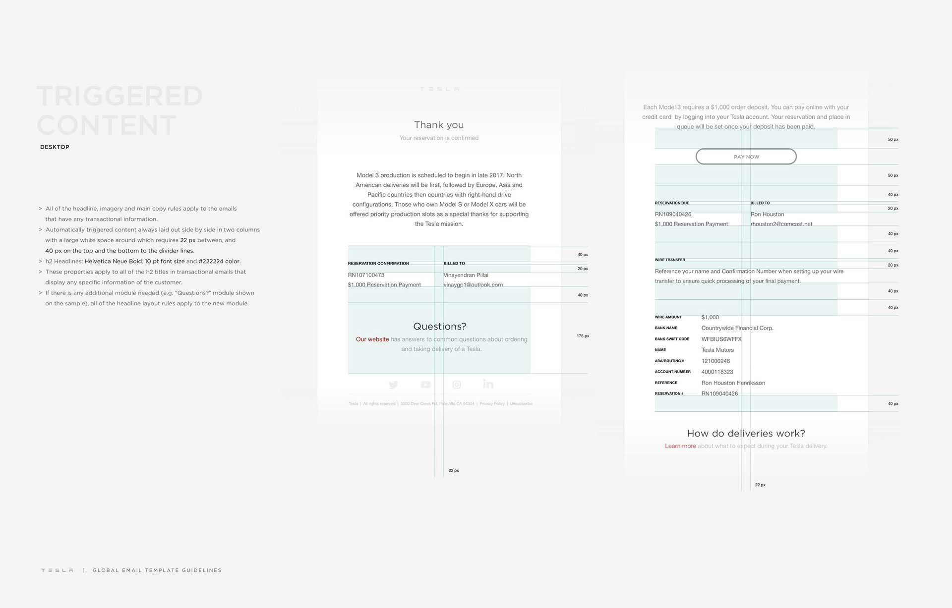 Email communication is vital for Tesla since it's never done a global scale marketing-advertising campaign. Along with the social media channels (consists of Twitter and Instagram), email is the only platform where Tesla communicates with the world and customers. I've created the extensive email guidelines book below that touches on as many circumstances as possible, while allowing designers to expand the contents in it if there's any new styles is needed.